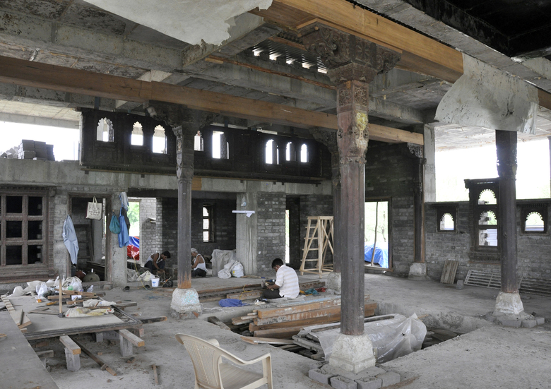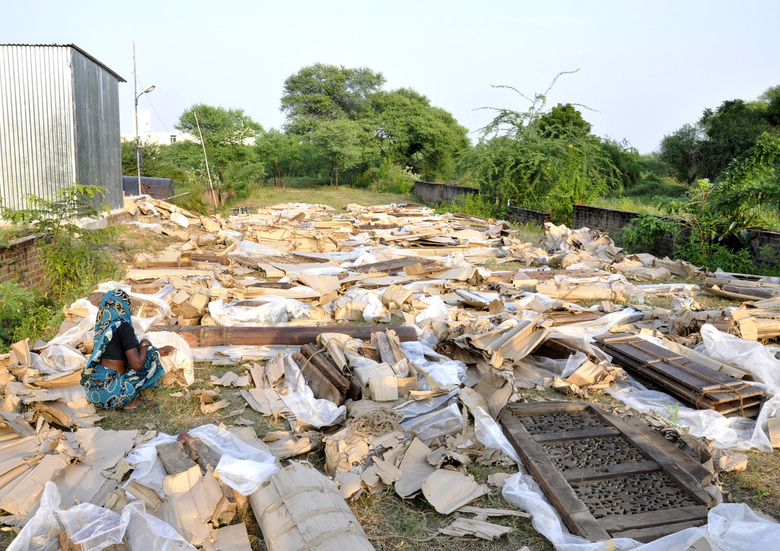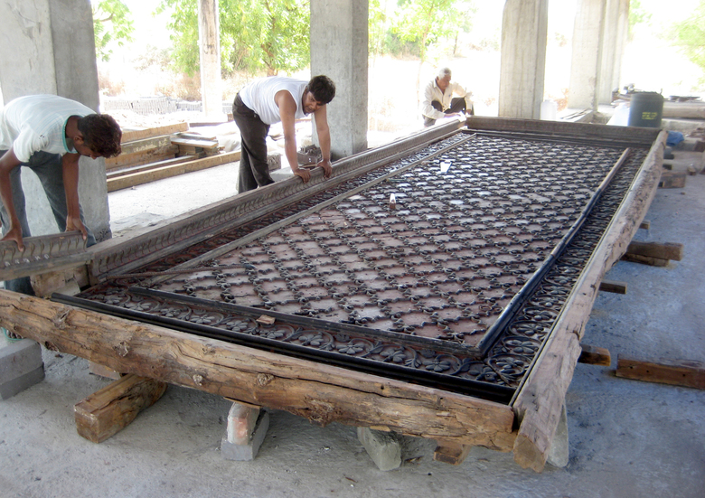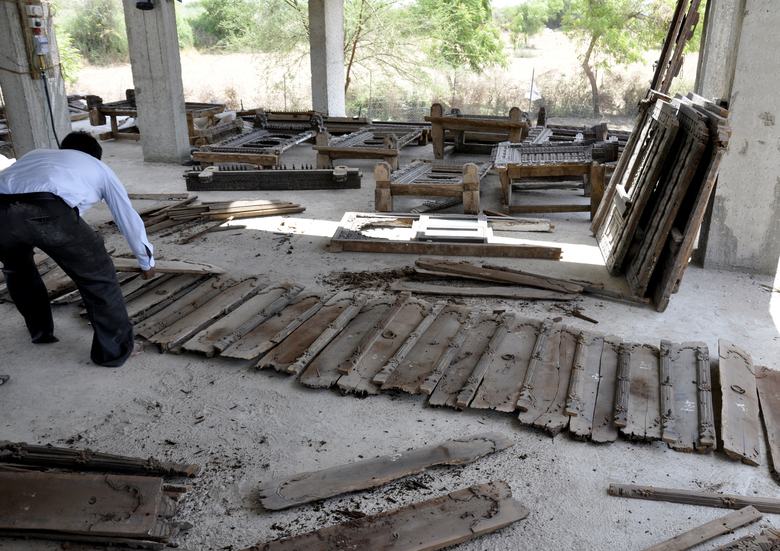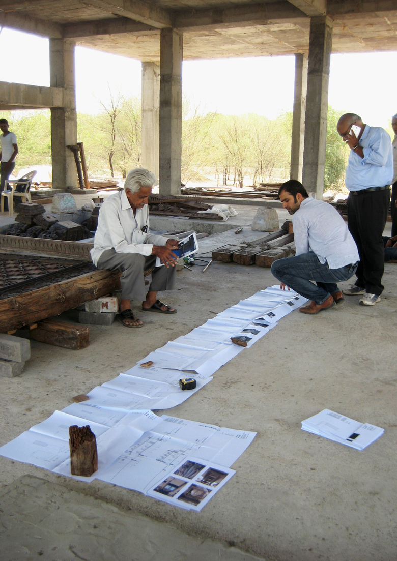 The process began with a video, taken by an owner ready to demolish a termite damaged but beautiful row house in northern Gujarat. Normally when this type of house is destroyed its parts of value are sold to various antique dealers. Instead, our client acquired the entire house, packed up all its parts, and stored them on his property near Ahmedabad. We began the conceptual design process with the video and a short list of elements with their basic dimensions. Only after agreeing on the direction of the design did we take one day (because we couldn’t risk the damage or theft associated with leaving elements out all night) to unpack as much as we could and measure critical dimensions. Already there we found many pieces not present in the list, and barely covered in the imagery. From those basic measurements we drew up the elements and developed the design. The first time we could completely open the elements and start to puzzle them out came after the columns, roof and plinth were finished. It was then that we began the conversations with our carpenters about what, where and how, given the basic framework of the courtyard we had seen and planned. As elements were unearthed, projected locations shifted to accommodate new pieces, or to hold related parts. We gradually moved away from drawings, making more decisions on site, because the argument couldn’t be divorced from the place and the artisan’s perspective.