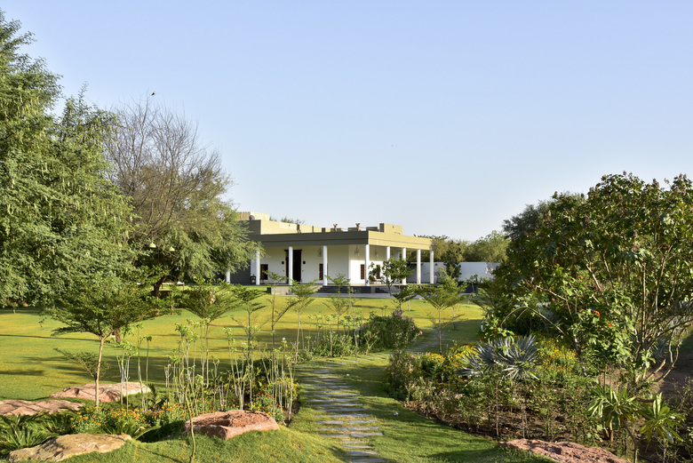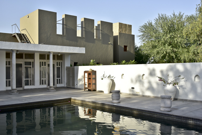 The house in the landscape was recreated from the pieces of a 300 year old haveli. In this structure we merge new and old systems of assembly, combining 18 inch brick walls in concrete frame with gutai lime plaster and restored tel paani finished teakwood elements. The basic form follows the original courtyard layout, flanked by bedroom, kitchen and mezzanine, while the wrapping terrace and sunken entry extend into the spaces outside, to transform the original row house layout into a part of the landscape.