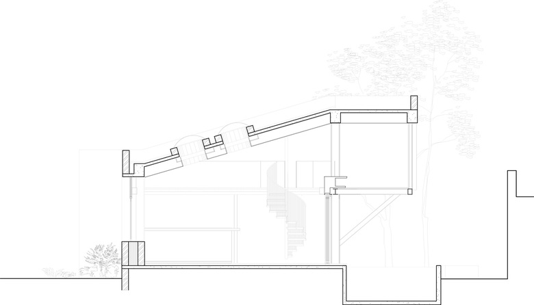 Placed in an already densely grown grove, the new lounge sits as a pavilion among trees. The lifted plane of the roof recreates the ground at the level of the leaves, and from it is suspended a balcony that overlooks the pool.