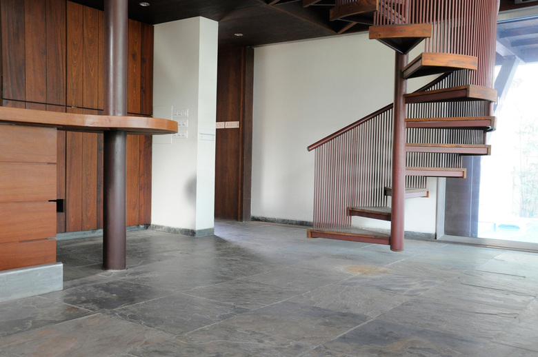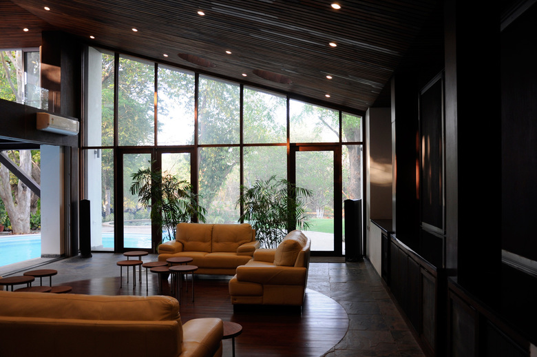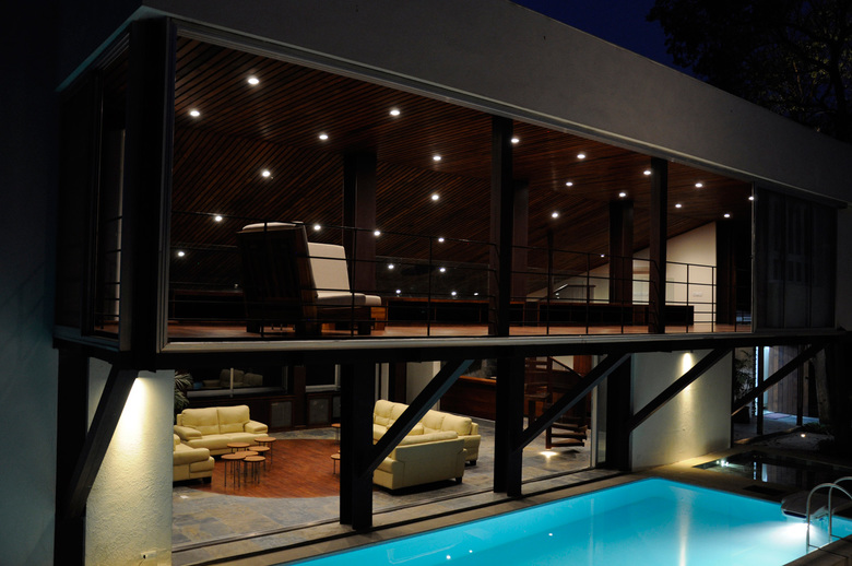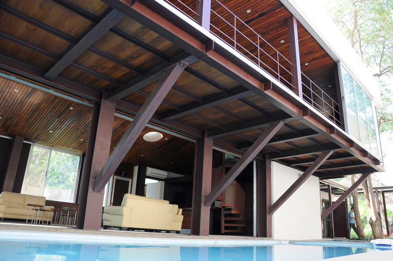 The composite structure uses steel to create the frame of the lounge and merges it with the concrete and brick of the service area by embedding the members in walls while allowing the steel to emerge when the space opens into the water and trees.