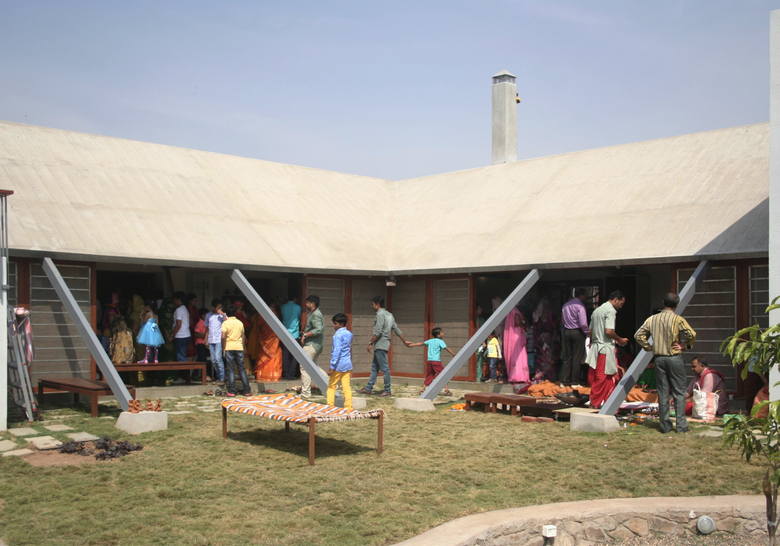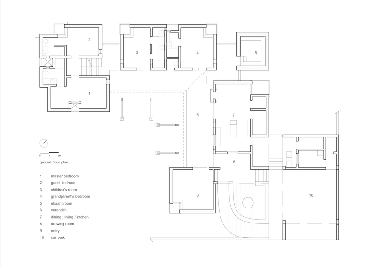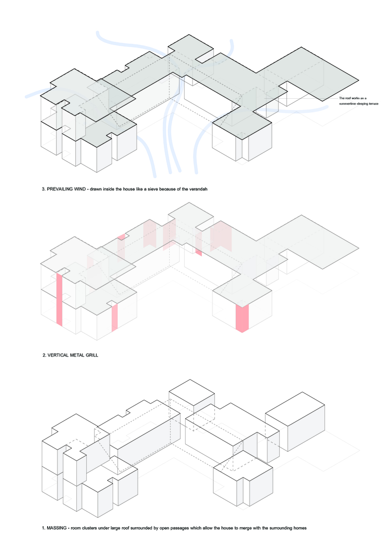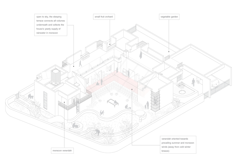 To support their condition of living between inside and out, the home consists of a group of shaded volumes clustered around an L-shaped verandah. Sheltered under the large roof, rooms are surrounded by open passages that draw wind through the house like a sieve. Thick brick walls temper the inside spaces against high diurnal temperature variation. The roof doubles as a summertime sleeping terrace, protected with high walls pocked by openings for targeted ventilation, and during monsoon it gathers rain for storage in a 40,000L underground water tank.