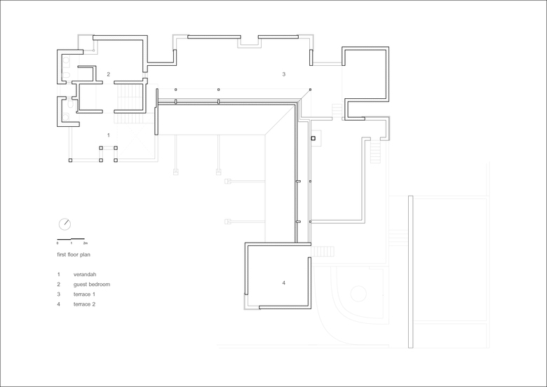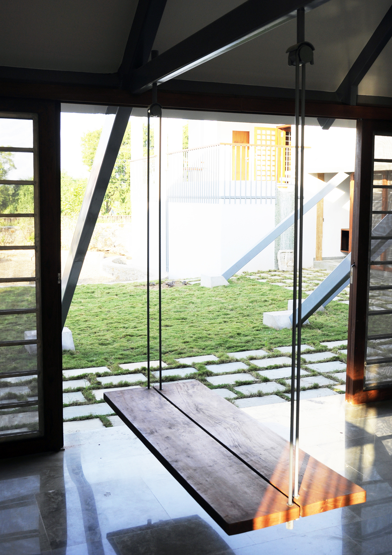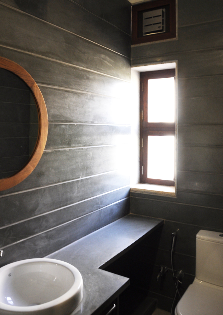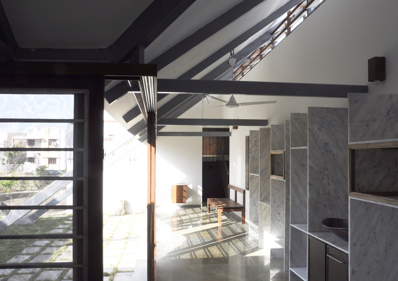 The verandah is the heart of the house. All rooms and all levels empty into it, and it mediates the experience between inside and out. Because much of the family activities occur in this intermediate space, what might have become a passage instead is a place. As a climate responsive element, it absorbs and exhausts the heat of the summer, welcomes warmth in winter, and encourages the movement of air in muggy monsoon. The high summer sun cannot reach direct room walls, and the sloping roof with ventilated openings at the top allows the hot air to rise and naturally exhaust, moving it faster because negative pressure behind the thrust of the wind moving up the verandah roof draws air out faster. In winter, these openings, which are fitted with operable louvers, can be closed to hold in the hot air. The fireplace in the verandah also adds to radiating heat in the space. In monsoon, and on summer evenings, gaps between the room clusters open to draw air through the space, cooling both the verandah and the outer surfaces of inside rooms.