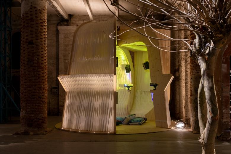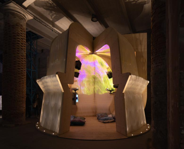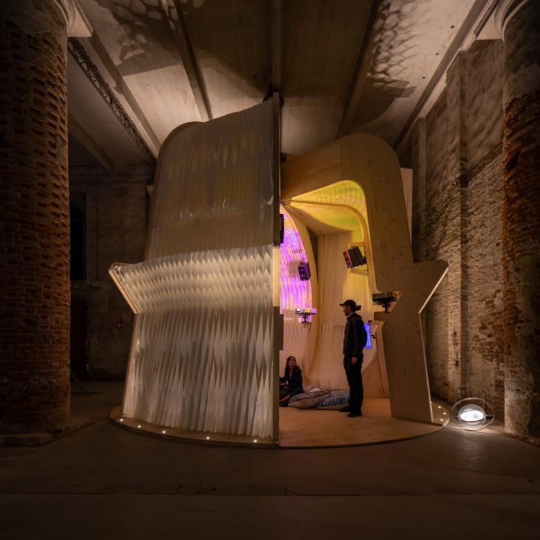 Inside, the installation becomes immersive through an interplay of digital projections and an acousmatic composition. Digital visuals and spatial soundscapes respond to the movement of visitors, creating a layered experience that transforms scientific data and ecological awareness into emotional, collective insight.
