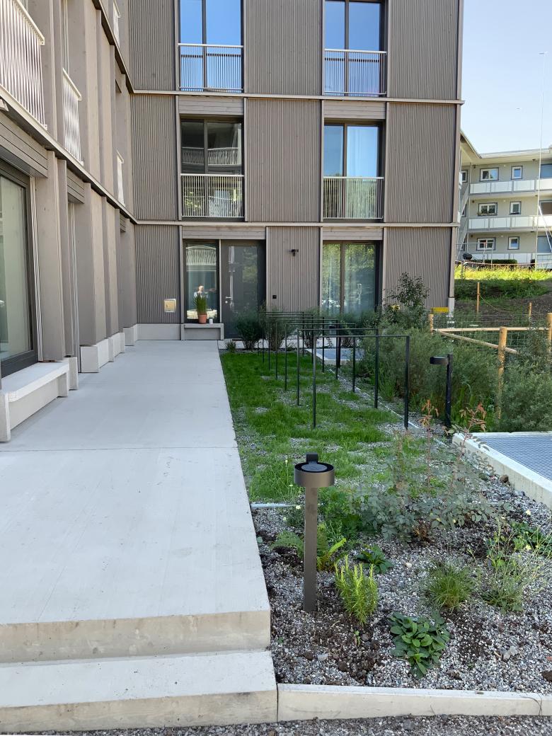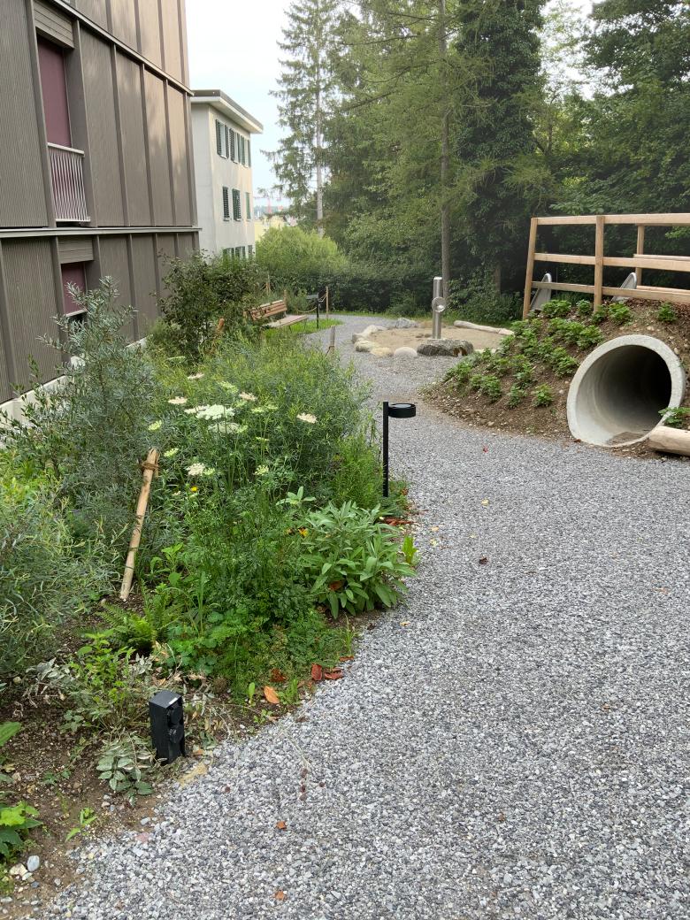 Drei Stampfbetonmauern terrassieren den Hof nach Osten und verbinden ihn zum höherliegenden Grünraum mit Kleinkinderspielplatz am Waldrand. Die extensive Wiese mit Sickermulden für die Gebäudeentwässerung integriert das gesamte Neubauensemble in die umgebende Siedlungslandschaft.