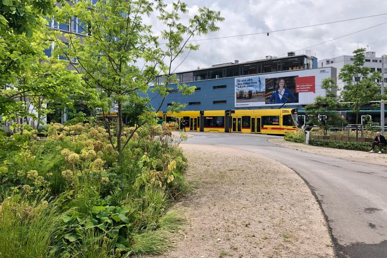 Üppige, baumbestandene Vegetationsinseln bilden den grösstmöglichen Kontrast zum städtischen Umfeld. Ihre Form und Lage ergibt sich aus den platzquerenden Erschliessungsströmen. Sie bilden im Zusammenspiel mit der Wassermulde einen Ort, der das Potential hat inmitten der umgebenden, dynamischen Verkehrsräumen eine eigene, entschleunigte Atmosphäre zu bilden.