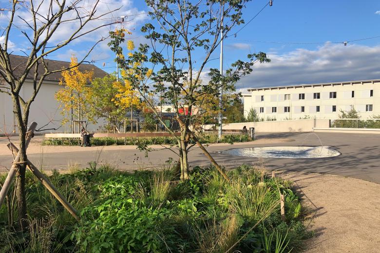 Der neue Irène Zurkinden - Platz im nördlichen Bereich des Stadtteils Dreispitz wird durch das bestehende Tramdepot und den prägnanten Neubau, sowie durch die Tramstation und die transparente Kante zur S-Bahn-Station gefasst.