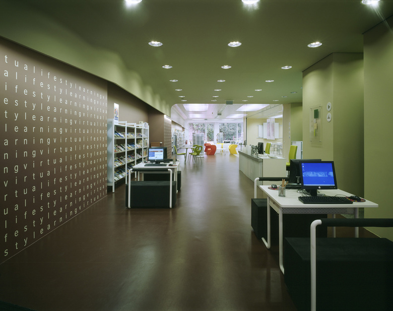 Sculpted staircases follow along the bended glazed façades. Lecture halls and the different departments with their laboratories and offices are located in the upper floors.