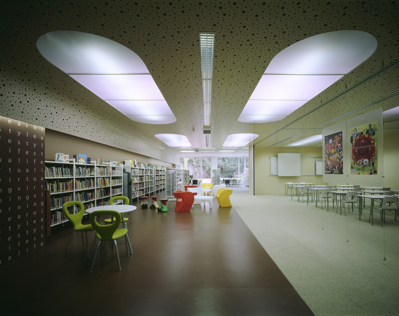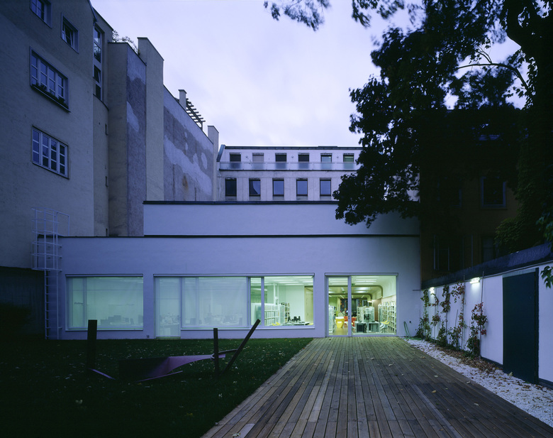 The building consists of two volumes, linked together by a glazed atrium. The ground floor is designed as transparent zone that opens up to the campus. It contains a multipurpose lecture hall on the west side which can be divided into three auditoriums or functions as one audimax. On the eastside there is a lounge for studying and communication that creates a view towards the campus, as well as a meeting room and secondary functions. The foyer situated in between the two volumes extends to the first floor.