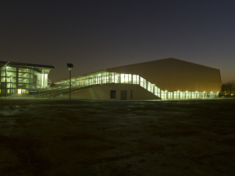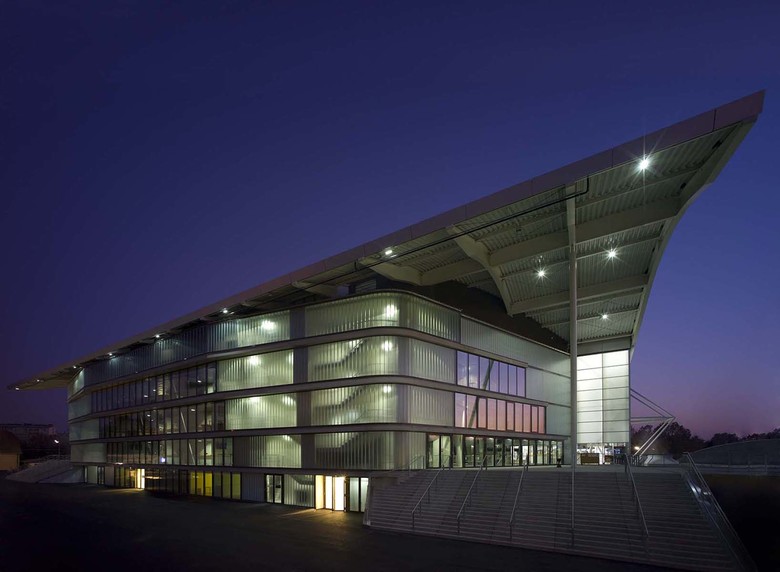 Die großen Tragwerke der Dächer scheinen die drei Hallen leicht zu überspannen, und geben großzügig den Raum für eine „promenade architecturale“ mit einer Abfolge von Durch- und Einblicken in die Eishallen und das Geschehen auf den Eisflächen frei. Der Umgang mit Licht, Transparenz, Materialität und Konstruktion bildet den durchgängigen architektonischen Leitfaden. So findet jede der drei Hallen ebenso wie das Restaurant, der Clubbereich oder der VIP Bereich, ihre eigene Position im Ganzen - und einen klaren Ausdruck.