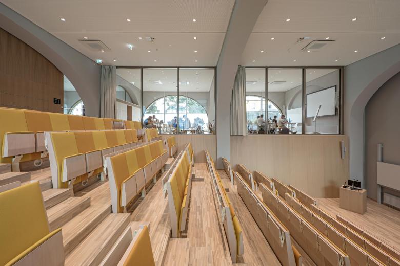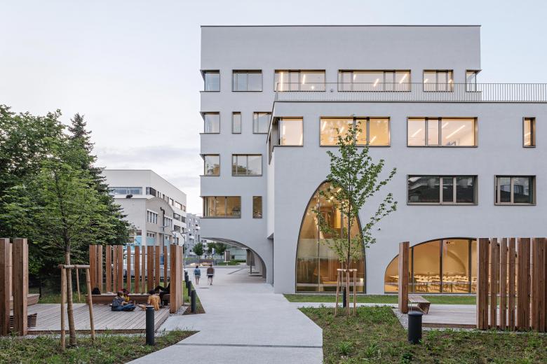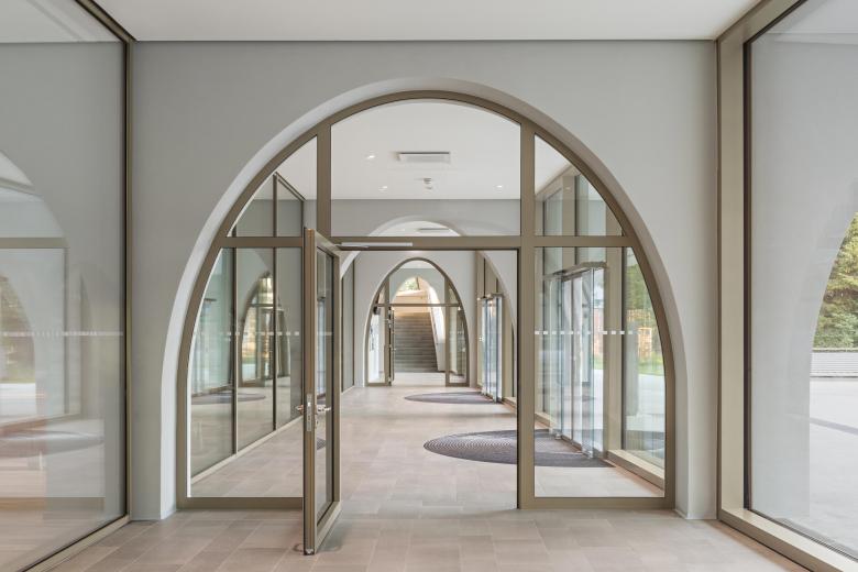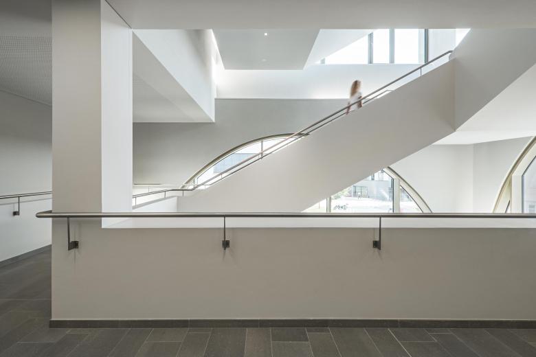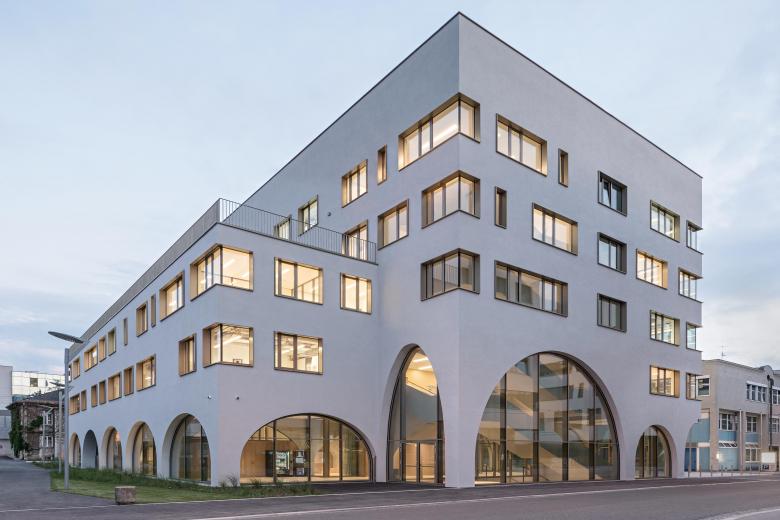 Ein deutlicher Rücksprung des Gebäudes im Osten ab dem 3. Obergeschoß wirkt wie eine diagonale Spiegelung des westlichen Rücksprunges der Arkade zum Vorplatz. Diese Rücksprünge regeln die Massstäblichkeit des Baukörpers und ermöglichen die präzise Eingliederung in den Kontext. Zugleich bieten diese beiden Situationen den Nutzern und Nutzerinnen des Hauses in Form der Arkade und einer Terrasse willkommene Freibereiche.