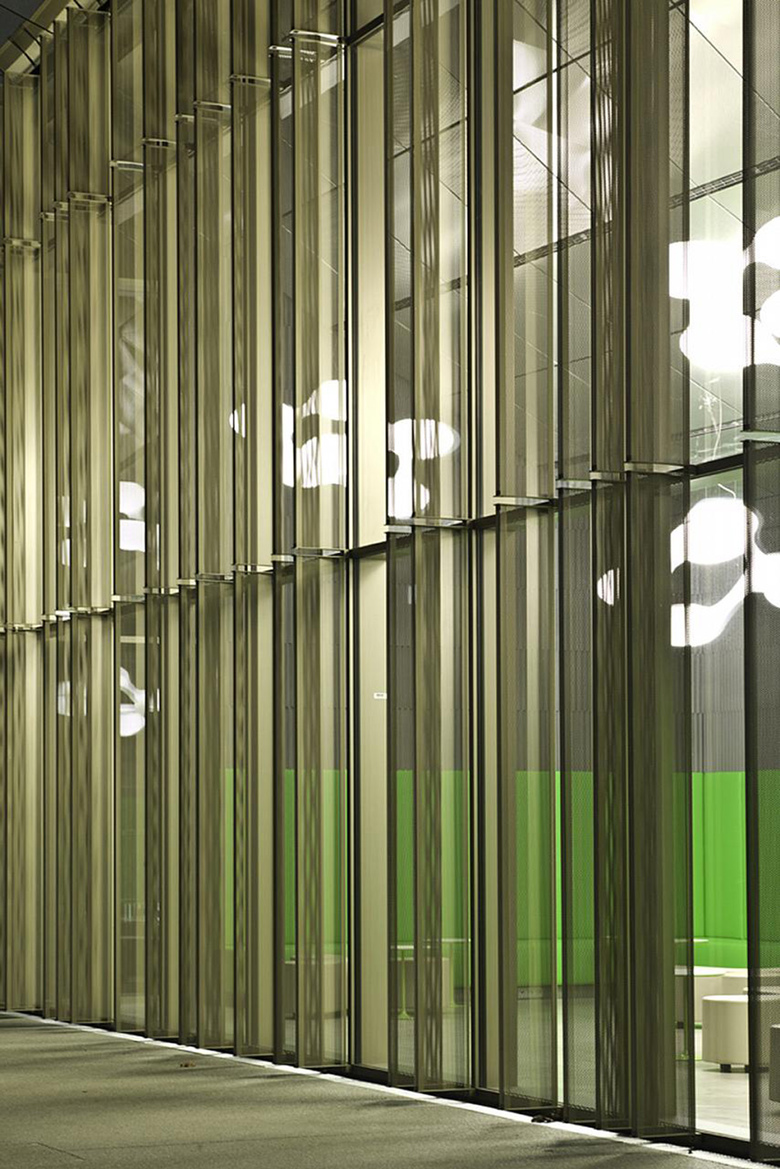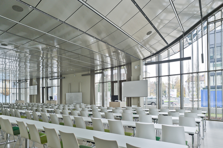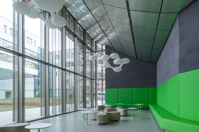 Die zweigeschossige Eingangshalle im Mittelteil, der „Marktplatz des Wissens“, kann auch für Feierlichkeiten und Empfänge genutzt werden. Von außen sichtbare Stiegen erstrecken sich skulptural entlang der gefalteten Fassade über alle Ebenen.