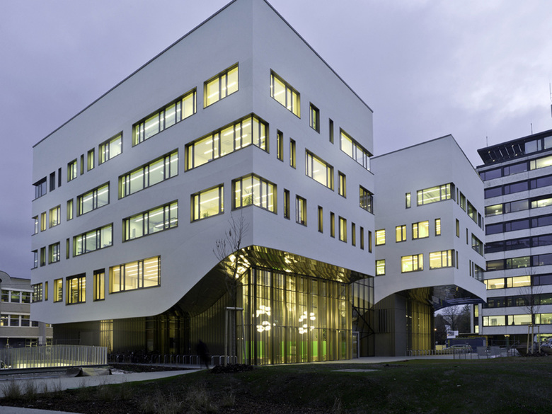 In den oberen drei Geschoßen befinden sich große Laborräume, Büros für die Institutsmitarbeiter sowie diverse Nebenräume, beispielsweise Räume für Zellkultur, Mikroskopie, zur Lagerung von Proben, Spülküchen und Geräteräume.
