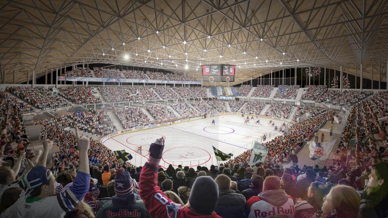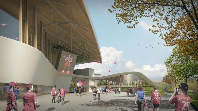 Ein scheinbar frei schwebendes Dach überdeckt die gesamte Arena mit ihren Umgängen und streckt sich schützend nach Osten über das vorgelagerte Foyer, um eine Verbindung zum tiefer liegenden Dach der Trainingshalle zu schlagen. Die auf- und abschwingende Dachlinie führt die Linien der umgebenden Landschaft weiter. Die Wellen des Daches heben dynamisch die Zugangsbereiche Nord, Süd und Ost auf natürliche Weise hervor. Die Auskragung des Daches schafft eine wettergeschützte Vor-Zone um das Gebäude, die an nassen und kalten Tagen die Wartezeit vor dem Matchbesuch angenehmer und attraktiver macht.