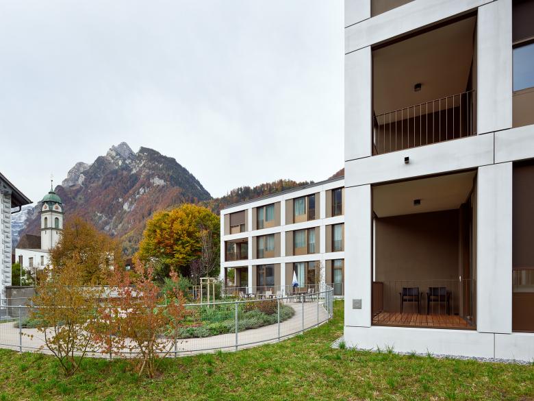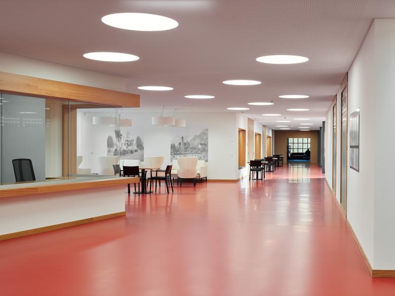 Die Erschliessung bildet das kommunikative und funktionale Rückgrat der gesamten Anlage. Korridore sind keine reinen Verkehrsflächen, sondern schaffen durch das Angebot von Sitzecken und Aussenbe-zügen eine Atmosphäre, die einladend wirkt und Begegnungen fördert. Die Pflegegeschosse sind durch eine wohnliche Intimität mit vielfältigen Aussen- und Innenbezügen und viel Tageslicht geprägt. Rundläufe mit Aufent- haltsnischen laden zum Verweilen und zu sozialen Kon- takten ein und fördern das selbständige Gestalten des Alltags. Die Zimmer sind alle zum Garten ausgerichtet und geniessen die atemberaubende Aussicht.