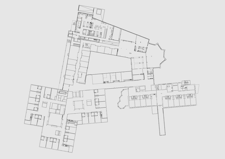 Ausgehend von der Lektüre des Ortes und den betrie- blichen Anforderungen werden die Bestandsbauten und der Neubau zu einem symbiotischen Ensemble vernetzt, das Synergien schafft. Die öffentlichen Nutzungen sind in einem Sockelbau organisiert, der zum Bestand ver- mittelt, während die Pflegegeschosse als kompaktes Volumen in Richtung Landschaftsraum angeordnet sind.