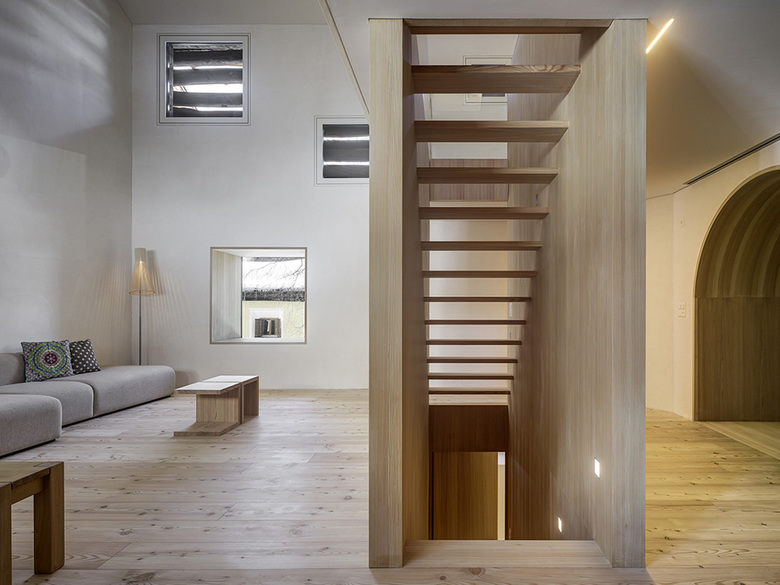 Im Innern wurde die Scheune als „Haus im Haus – Prinzip“ mit vorfabrizierten Holzrahmen-Elementen ausgebaut. Der überhohe Wohnraum schafft eine unerwartete räumliche Grosszügigkeit. Die kompositorisch angeordneten Fenster bieten hierbei unterschiedliche Lichtstimmungen und präzise Ausblicke in die Umgebung.