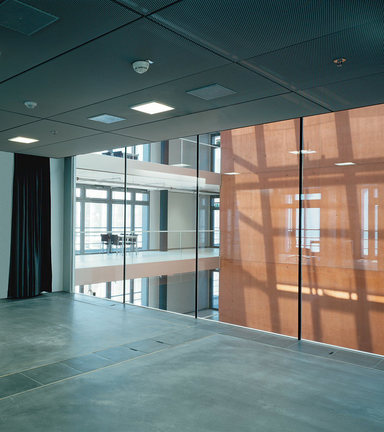 Die Räume der unterschiedlichen Nutzungszonen gruppieren sich um das 5-geschossige Atrium, das durch die schwebenden Sitzungsboxen, den Treppenaufgang und die Sichtbeziehungen zum räumlichen Erlebnis wird. Die flexibel nutzbaren Räume an der Aussenfassade ermöglichen neue Arbeitsformen mit frei vernetzbaren Arbeitsplätzen. Seminarräume, ein Vortragsaal und Bibliothek sowie ein Personalrestaurant komplettieren das vielfältige Raumangebot.