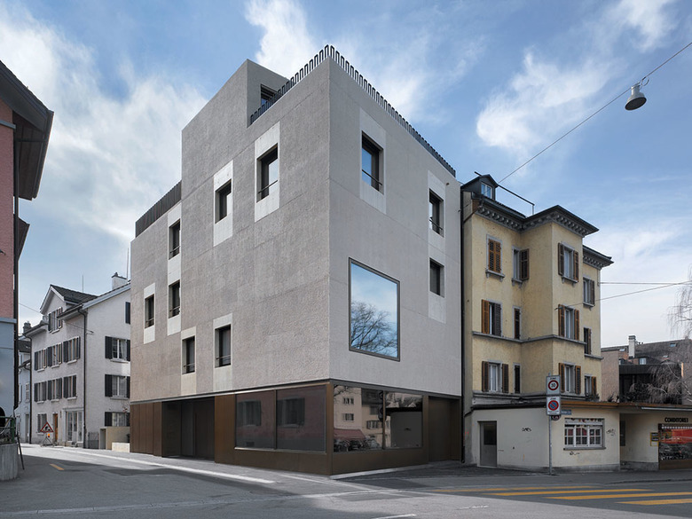 Der gestockte Beton der Fassade ergibt ein lebendiges Spiel entsprechend dem eines Verputzes und geht einen Dialog mit der städtischen Umgebung ein. Eine ausgewählte Zuschlagsmischung aus Kalkstein gibt dem Neubau einen warmen, erdigen Farbton, der sich in das Bild der umliegenden Gebäude am Hottingerplatz eingliedert.