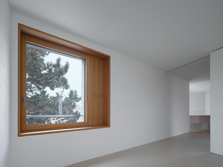 Das Erdgeschoss hebt sich durch Materialisierung und Nutzung von den Obergeschossen ab. Grosszügige Verglasungen präsentieren die Ateliernutzung der Öffentlichkeit. Die Obergeschosse öffnen sich zurückhaltend gegenüber dem Strassenraum, ein übergrosses Fenster zum Platz markiert den dahinterliegenden zweigeschossigen Wohnraum.