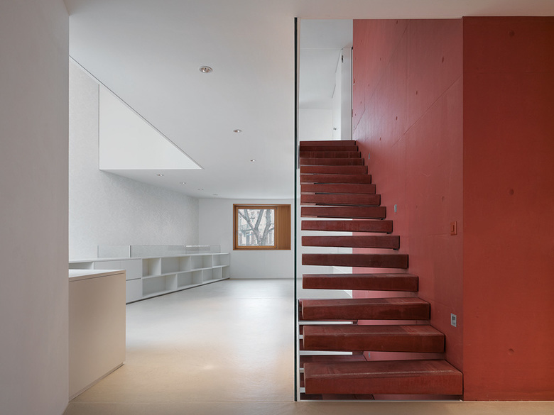 Die Geschosse entwickeln sich entlang des durchlaufenden rot eingefärbten Sichtbetonkerns. Zweigeschossige Räume verknüpfen die Geschosse spannungsvoll miteinander.