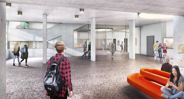 Die starre räumliche Struktur wird durch flexible Füllungen ergänzt und aufgebrochen, so dass anpassbare Klassen- und Arbeitsräume und eine höhere Nutzungsdichte geschaffen werden. Modulare Wandelemente zwischen den einzelnen Klassenräumen und zum Korridor erhöhen die räumlichen Qualitäten im gesamten Klassentrakt. Transparente und schaltbare Räume beidseitig der Treppenanlage schaffen eine Lehr- und Lernumgebung, die sich an die jeweiligen Lernbedürfnisse anpassen lässt und stellen eine bessere Belichtung der Erschliessungsbereiche und Orientierung im Gebäude sicher.