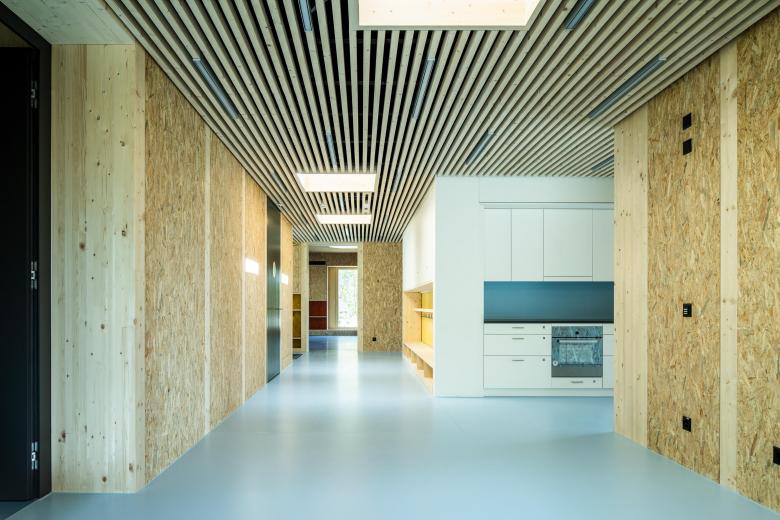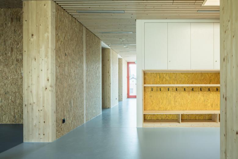 Die Aufteilung des Grundrisses in einen flexiblen und als Rundlauf organisierten Gemeinschaftsbereich sowie drei abgeschlossene Raumzonen (Spielen, Schlafen, Büro) ermöglichen es, individuell auf die unterschiedlichen Bedürfnisse der Kinder im Tagesverlauf reagieren zu können. Die möblierten Fassaden bilden von innen Fenster- und Sitznischen aus, die von den Kindern spielerisch entdeckt und genutzt werden können.