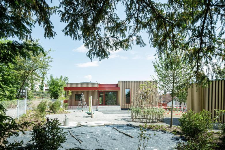 Die im südlichen Arealbereich gelegene Kinderkrippe nimmt das Thema des «Feenwaldes» als Gestaltungselement auf. Die ebenerdige Organisation der Kinderkrippe mit grosszügigen und differenzierten Aussenbereichen, mit Spielangeboten sowie Räumen und Nischen zur individuellen Aneignung schafft ein lebendiges und anregendes Umfeld für die Kinder.