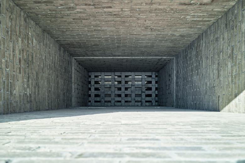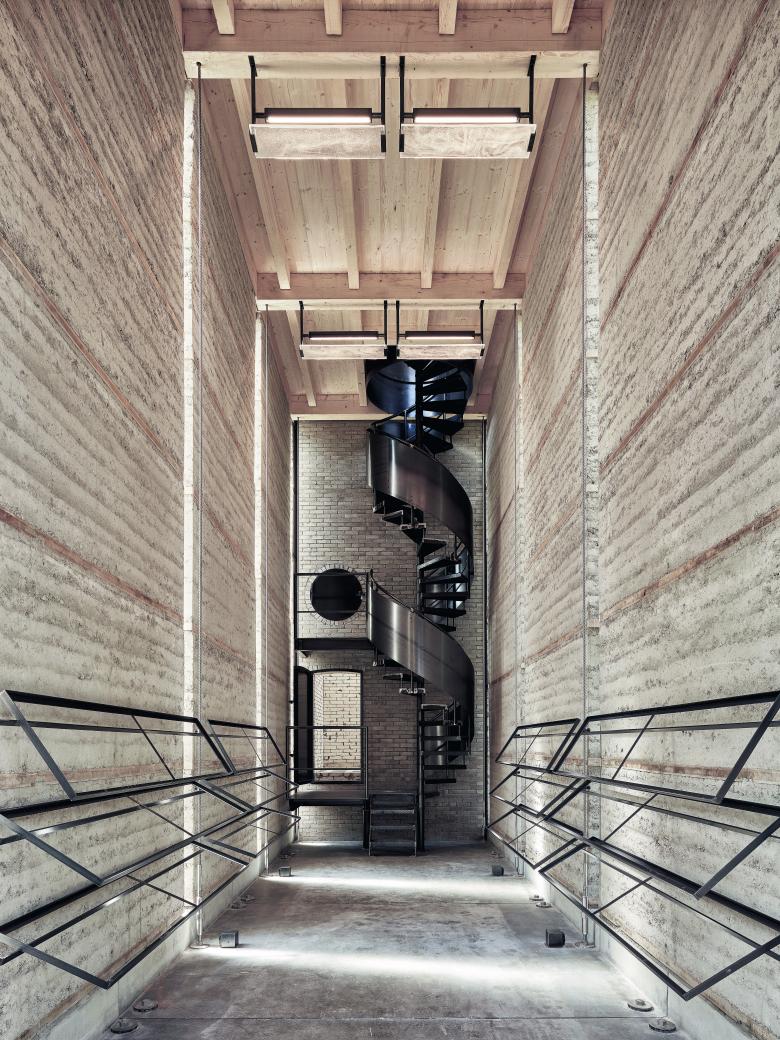 Der Ausstellungsraum mit anschliessendem Ofen hat eine massive, aussteifende Holzdecke. Sein Charakter wird durch die Präsenz des Lehms und die Monumentalität der abschliessenden Ofenwand geprägt. Durch die Lichtschlitze der offenen Fugen, vor denen die Vorspannung verläuft, wird die ganze Massivität der Lehmwände erlebbar, die in Kontrast zur Filigranität der Zugstäbe steht. An diese können einfache Stahlrahmen geklemmt werden, die Ausstellungspaneele oder Exponate halten. Eine Wendeltreppe aus Stahl erschliesst die Aussichtsplattform auf dem Dach.