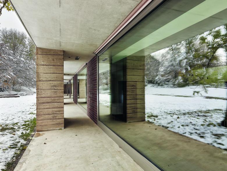 Eine Erweiterung des Baukörpers, die mit einer Aufweichung der repetitiven Struktur der Zimmer verbunden ist, lässt am westlichen Ende des Gebäudes eine Art Kopf entstehen, der das Volumen zum Abschluss bringt und fest in der Geländesenke verankert. Eine neue Loggia im Süden vermittelt nicht nur räumlich, sondern auch symbolisch und in der stofflichen Präsenz des Stampflehms zwischen dem Haus und der kultivierten Natur seiner Umgebung. Mit kräftigen Ecken und regelmässigem Rhythmus betonen ihre Pfeiler die niedrige, lang gestreckte Gestalt des Baus und verweisen auf dessen innere Struktur mit sechs aneinandergereihten, miteinander verbundenen Räumen.