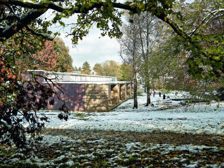 Ein bestehender Schulpavillon, 1958 von Jacob Padrutt (1908–1960) als Erweiterung der benachbarten Schulanlage errichtet, wurde überformt, erweitert und als Hort- und Schulgebäude umgebaut. Grundriss und Schnitt basieren auf der Disposition des Vorgängers, modifizieren diese jedoch derart, dass aus dem kompakten, in die Umgebung hineingestellten Gebilde ein lebendiger Organismus wird, der sich mit seiner Umgebung verbindet. Der Bau ist in einen Grünzug eingebettet, der das städtebauliche Rückgrat des Quartiers bildet. Dieses verbindet wichtige öffentliche Gebäude und Anlagen und formt mit den anschliessenden Siedlungen zusammen eine offene, parkartige Stadtlandschaft. Das organisch formulierte Platz- und Wegsystem der Umgebungsgestaltung greift Themen des Gebäudes auf, indem Bänke und Spielmöglichkeiten mit Stampfbetonmauern gefasst sind, die KolumbaTM-Steine der Fassaden werden als Rasengittersteine eingesetzt.