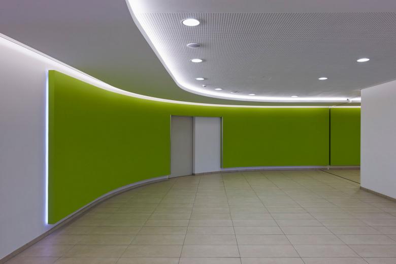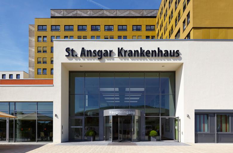 Nach Abriss der vorgelagerten Rampen und Umplanung hat das St. Ansgar Krankenhaus nun eine völlig neue Erschließung auf der heutigen Erdgeschoßebene bekommen. Hier gelangt der Besucher in einen großzügigen Eingangsbereich mit Cafeteria und Konferenzräumen auf der einen Seite sowie einer Zentralambulanz mit Liegendanfahrt auf der anderen Seite. In der oberen Ebene ist die Kapelle neu angeordnet und künstlerisch gestaltet. Eine helle Gestaltung mit Akzentfarben schafft innen wie außen eine angenehme Atmosphäre.
