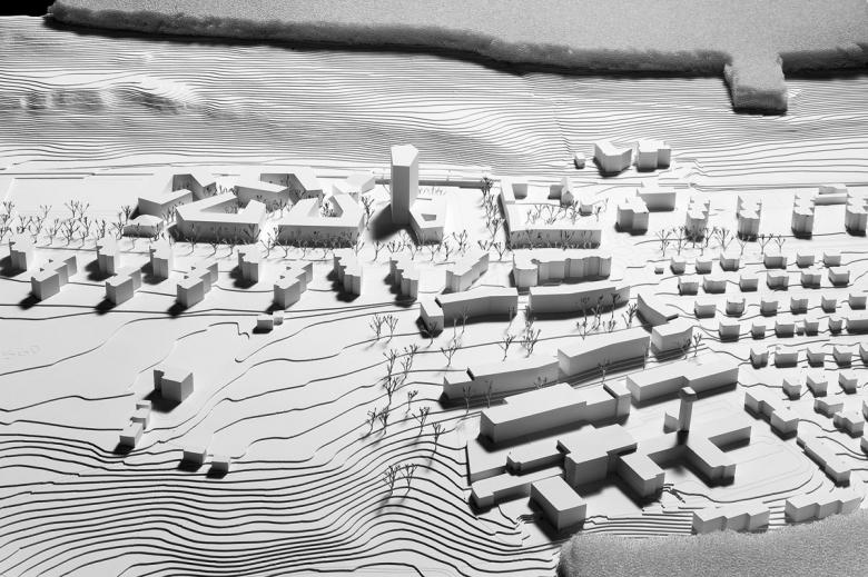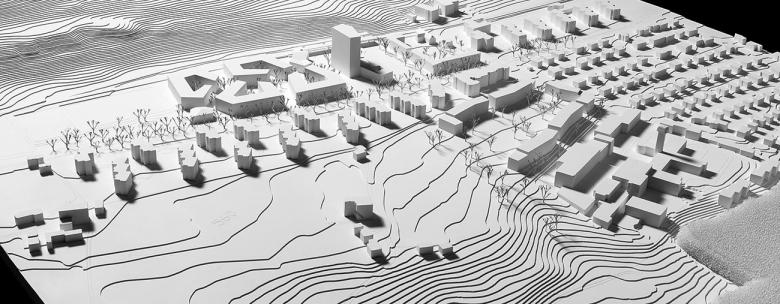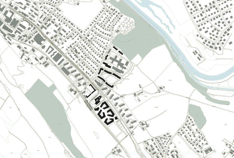 Städtebauliche Planung Zentrumsentwicklung / Am Fusse des Gurten, des Berner Hausbergs im Süden der Stadt, bedingt ein geplanter Knoten aus S-Bahn, Tram und Bus 20 Hektar Siedlungsrand neu zu ordnen. Um die betreffenden Teilgebiete hier, entlang der Ausfallachse Seftigenstrasse, mit den geforderten 2'000 Büroarbeitsplätzen, 300 Wohnungen, Einzelhandelsflächen und Infrastruktur stadträumlich zu "befestigen", werden sie von ihren jeweiligen Rändern her besetzt: