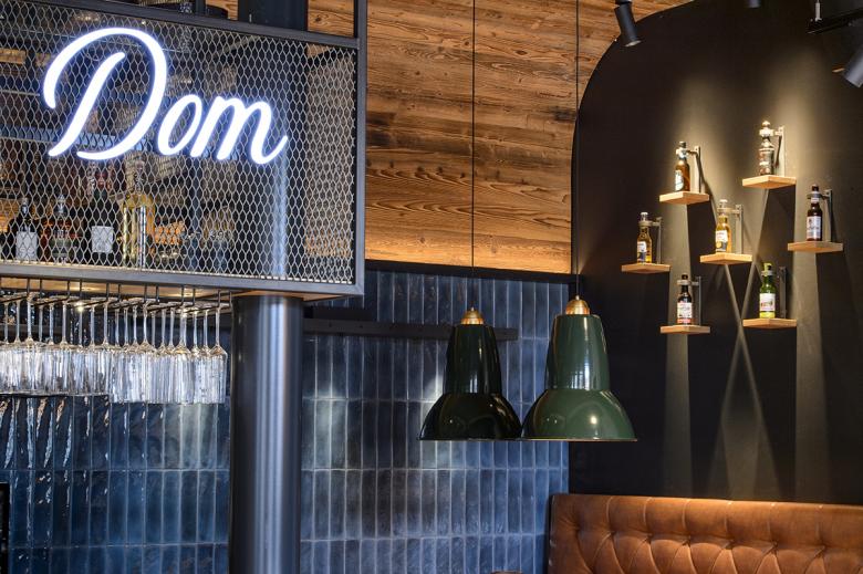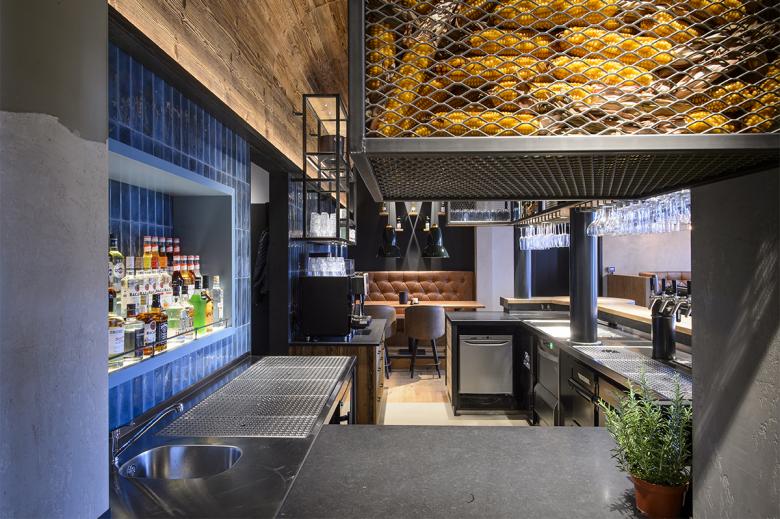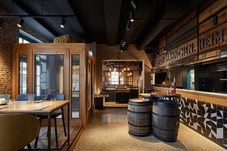 Der Restaurantbereich mit dem einstigen „Vorstandszimmer“, die neu gestaltete Gaststätte und die Braterei bieten zusammen 107 Plätze. Beim Eintreten fällt der Blick sofort auf die Leuchtschrift „Hopfen. Hähnchen. Heimat.“ über dem Tresen und die zehn Quadratmeter große Feuerwand, an dem das Geflügel am offenen Feuer zubereitet wird. Damit sind die Themen gesetzt: 40 Sorten Bier und bestes Kikok-Hähnchen von der Rotisserie gepaart mit uriger und heimatverbundener Kneipenkultur in moderner Interpretation.