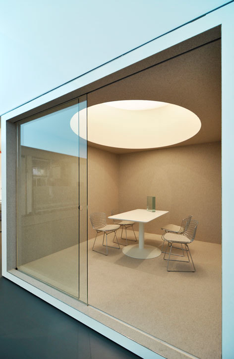 Dadurch entstehen an den Ecken 4 Besprechungszonen sowie eine zentrale Kommunikationsfläche im Atrium. Die beiden Konferenzräume sind vollflächig mit Filz ausgekleidet und durch einen ovalen Deckenausschnitt belichtet.