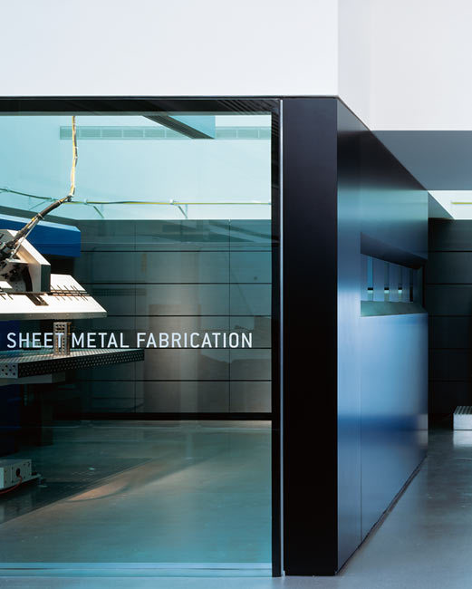 Der Pavillon im Vorführzentrum des Unternehmens ist analog der beiden präsentierten technologien und des Themas Lasernetwork symetrisch ausgebildet. Das Laseraggregat ist im zentralen Portikus platziert. Eine Multifunktionswand im Inneren der beiden Räume beinhaltet die notwendigen technischen Installationen und wird für die Präsentation von Werkzeugen und Komponenten genutzt.
