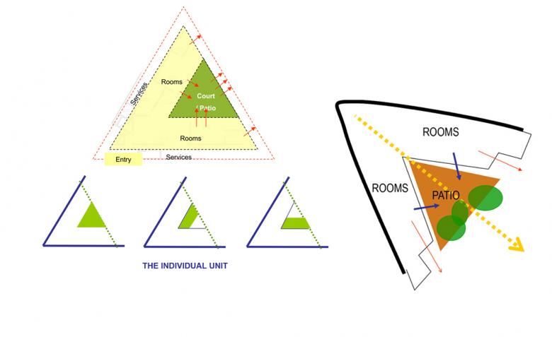 The project captures propositions about livability at level of the individual apartment, the tower and the site. An individual home often has a strong sense of center (courtyard) which is in this case is developed by focusing on living verandahs and capturing sweeping views. Radiating form provides privacy by ensuring that no apartment looks directly into another apartment. The tower scale the facade by rhythmic cascades of verandahs, and the height and segmented articulation creating an iconic form. The site creates a sense of community by centering on a large verdant landscape of spaces for gathering, recreation and relaxation; anchored at the two ends by a retail block and a clubhouse.