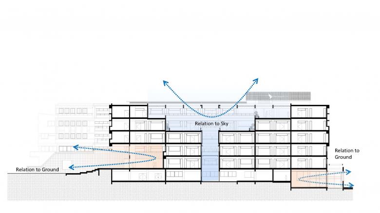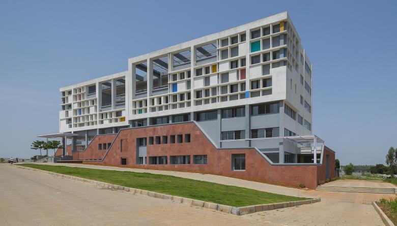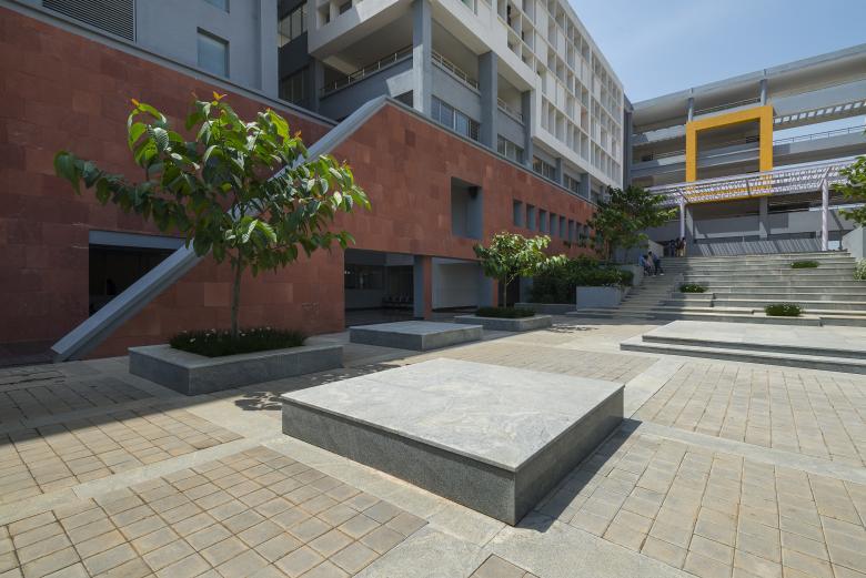 The CMR University campus site abuts a lake and is surrounded by quarries, while containing one such quarry within the site. The master plan is held by a spine, that links the lake and the quarry while also allowing for all the disciplines to open out into it. Various town squares and community courts comprise this spine, which becomes a place of memory with the interacting of all the discipline. The School of Engineering Campus is connected to the spine through a series of courtyards, forming a layered circulation within the campus. The Phase 1 building is designed for 720 students across 3 disciplines. The Common facilities between the departments like the Labs and Workshop areas are distributed in the lower levels where there is always a buzz of movement and the Classrooms are located on the top levels, offering them quite environment and privacy. The Classrooms on the higher levels have a deck outside their class rooms which doubles up as a place for smaller group gatherings and discussions. The staggering corridor on the inside offers a volumetric experience to the circulation, not making it less claustrophobic. The two wings of the block connected by common amenities like Seminar halls and labs in the middle, which overlooks into the Central Court with Amphitheatre, where large gatherings are held.