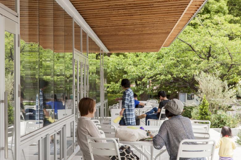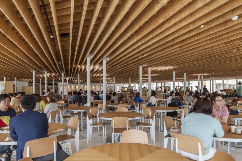 「The University DINING」は、いつでも学生達が自然と集い、新しい発想が次々と想像されるような環境を提供し、キャンパスライフの新しい拠点となることを目指しました。透明な外周は、外の環境と連動する快適な空間を創ると同時に、飲食はもちろん授業の合間の語らいや、少人数でのゼミなど様々な活動が、開かれた場で行われ新しい出会いが生まれる事を期待しています。建築は、自然界で人が心地よいと感じる1/fゆらぎのリズムをプログラム化し、構造解析と共に木梁の配列を決定しました。約1,000パーツのLVL材(単層板積層材)を上下2段に組み、細い鉄骨柱で支えています。木ピッチの幅を波のように振幅させることで、トップライトからの光を柔らかく変換しています。それは、木漏れ日のような優しい光に包まれた、インティメイトな空間を実現するためです。見る方向・座る場所によって様々な表情をつくりだしています。現在、学生はもとより地域の子育て世代や高校生も集い、高齢者の散歩コースの拠点となっています。学生教職員はもちろん、様々なゲストの方々が集い、生き生きとした交流が生まれています。