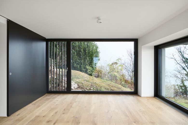 Die neue Grundrissgliederung pointiert die im Bestand angelegte starke Orientierung zum See hin. Die Wohn- und Schlafräume sowie das grosszügige Badezimmer sind - auf zwei Geschossen verteilt - in einer südseitigen Raumschicht situiert. Dunkle lineare Elemente wie Fenster- und Türrahmen setzten Akzente und fassen die Ausblicke.