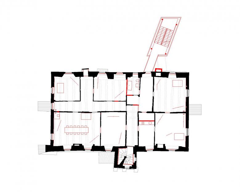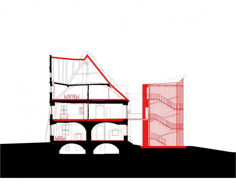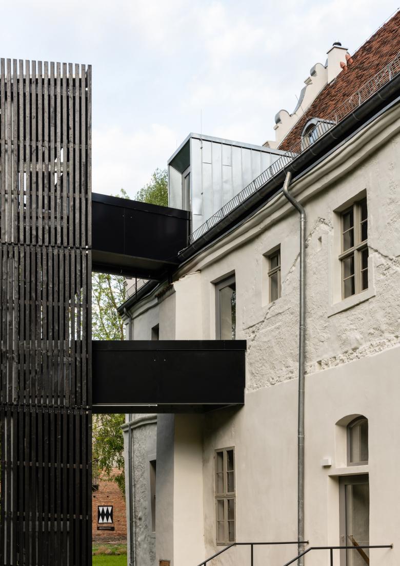 Deutlichster Eingriff jedoch ist die Errichtung eines externen Treppenturmes, der sich markant hinter dem Bauwerk erhebt, als wolle er einen stabilisierenden Anker für den sich nach vorn neigenden, historischen Schlossturm bilden. Die mit karbonisiertem Holz verkleidete Stahlkonstruktion schließt als sichtbar zeitgenössisches Element an das Schloss an und stellt mit seiner rauen, rußigen Oberfläche ein eher dem angrenzenden Wald zugewandtes Pendant zur strahlend weißen Putzfassade dar.