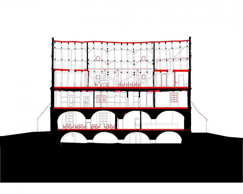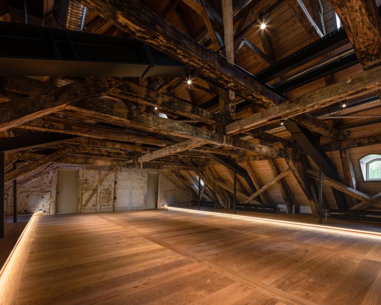 Manche Ergänzungen der jüngeren Vergangenheit mussten allerdings zwangsläufig weiterverwendet werden, denn zuletzt war die Standsicherheit nur durch ein Korsett aus Stahlträgern und Zugstangen gewährleistet, das stellenweise zwar entfernt werden konnte, im Veranstaltungssaal aber in Form von neuen konstruktiven Bauteilen neben dem alten Dachstuhl sichtbar verblieb.