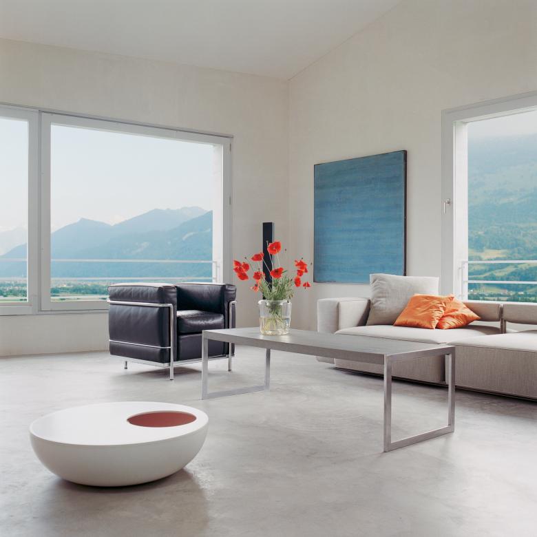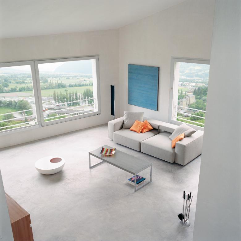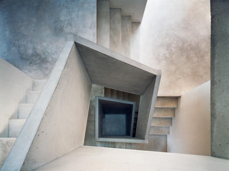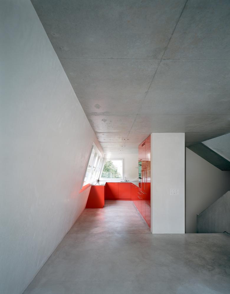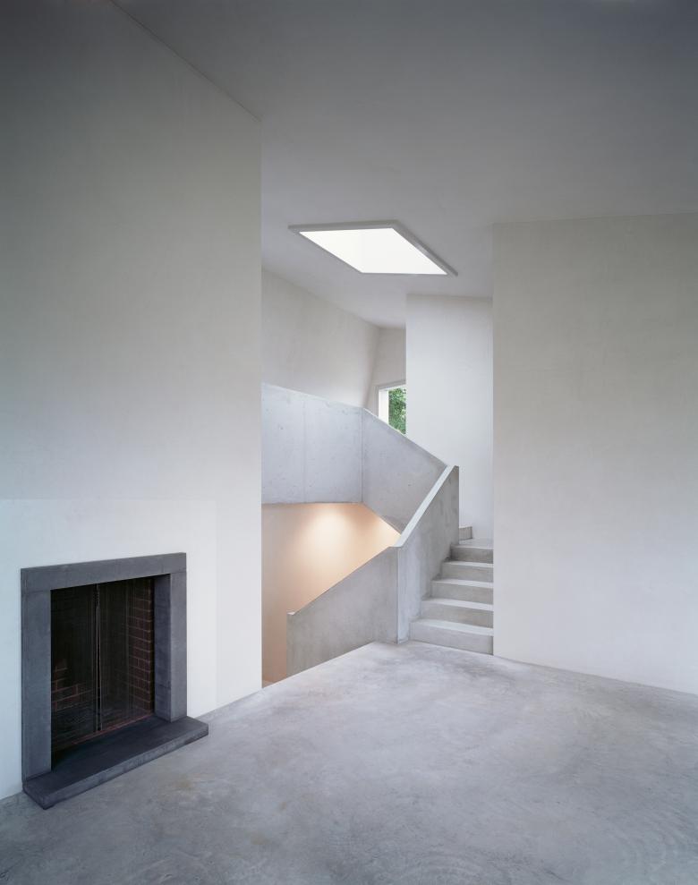 Im Gebäudeinnern sind die im Grundriss und Schnitt zueinander verschobenen Räume um eine vierläufige, zentrale Treppe angeordnet, immer bezogen auf diese und durch diese miteinander verbunden; die Offenheit der Wohnräume gegenüber der Treppe bewirkt einerseits die im Kontrast zur äusseren Kargheit stehende innere Grosszügigkeit des Gebäudes und lässt andererseits die spezielle Hanglage mit den sehr unterschiedlichen Ausblicken in die Landschaft des St. Galler Rheintals in jedem einzelnen Raum spürbar werden.