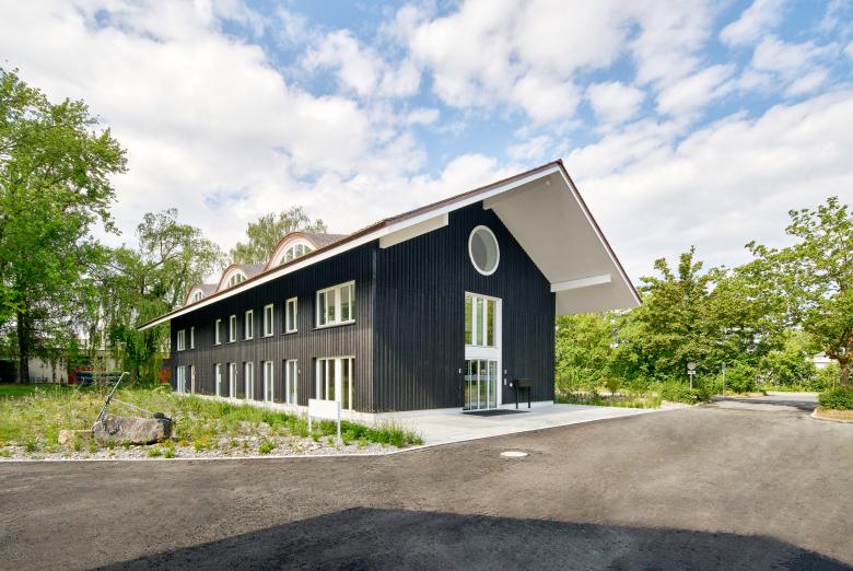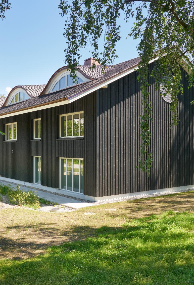 Das bestehende Gebäude wird nach Süden erweitert. Durch eine einheitliche Fassadenmaterialisierung, welche auch eine neue resp. zusätzliche Dämmung umfasst, und durch das Weiterführen der bestehenden Fassadenstruktur sollen Alt- und Neubau als neues Ganzes wahrgenommen werden. Eine dunkel gestrichene, vertikale Holzverkleidung und an der Stirnseite ein Rundfenster sollen dem Haus einen zeitgemässen Ausdruck verleihen und an die benachbarten Bootshäuser erinnern.