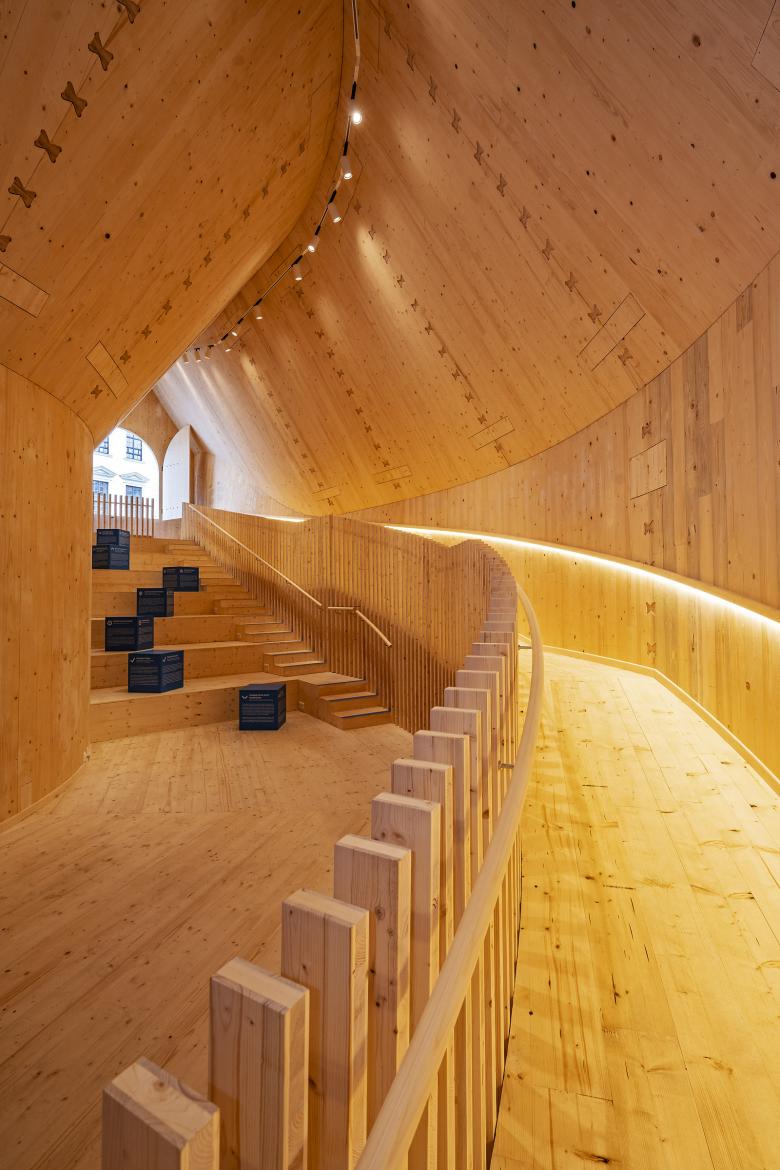 Nachhaltigkeit spielte bei der Wahl dieses strukturellen Ansatzes eine entscheidende Rolle. Denn Holz speichert Kohlenstoff, anstatt ihn in die Atmosphäre freizusetzen. Der modulare Aufbau des Pavillons mit Elementen, die aus im CLT-Verfahren kreuzweise verleimten und gepressten Sperrholzplatten gefertigt sind, machen den Pavillon zudem leicht demontierbar, so dass er in einem sozialen oder nachhaltigen Kontext ein zweites Leben haben kann. Großen Wert auf Nachhaltigkeit legte der Bauherr auch bei der Beleuchtung und entschied sich für LED-Licht. Zudem sollte das Kunstlicht dem honigfarbenen Ton des Holzes schmeicheln, den Raum besonders gleichmäßig ausleuchten und in dem ansteigenden Vortragsraum brillantes Licht für gutes Sehen liefern. Zum Einsatz kamen justierbare Spy-Strahler von Delta Light, die an einer im Dachraum abgehängten flexiblen Stromschiene, die der Krümmung des Raumes folgte, montiert waren. Der vordere ebenerdige Raum, in dem die Besucher eine Ausstellung über die "Fuggerei der Zukunft" erleben konnten, wurde von Hedra-Leuchten, die spielerisch in unterschiedlichen Höhen abgependelt waren, erhellt.