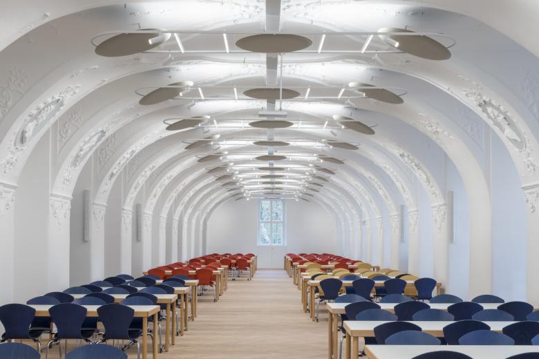 Die Anspeisung der Leuchten erfolgt über eine kleine, geschlossene Kabeltasse über die gesamte Raumlänge von den Stirnseiten des Saales aus. Mit den direkt/indirekt-Lichtbändern wird eine gleichmäßige Raumausleuchtung erzielt.