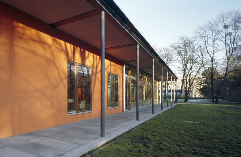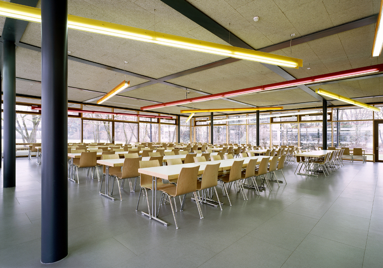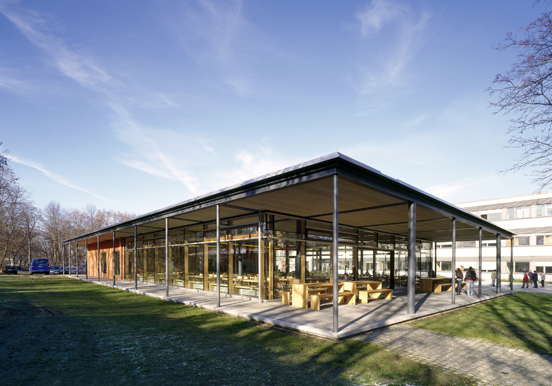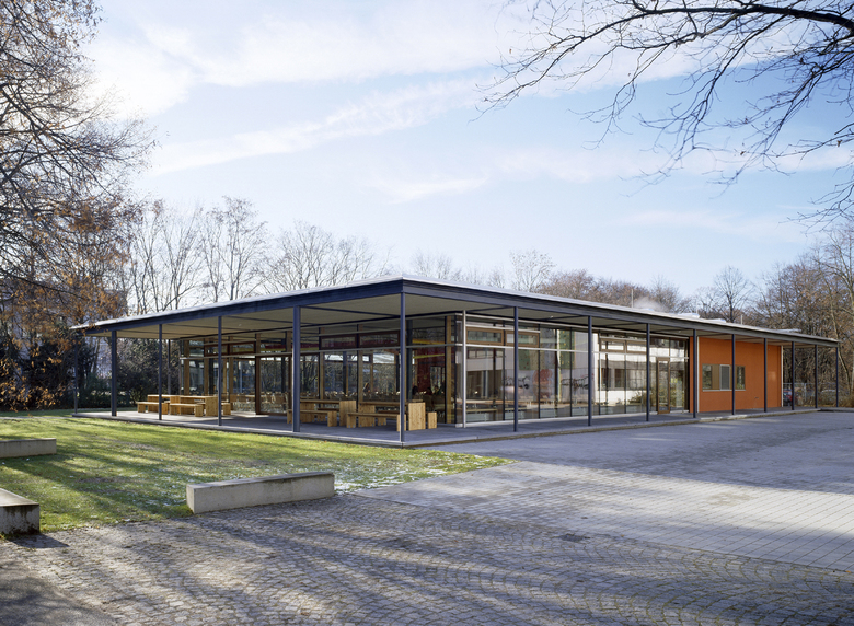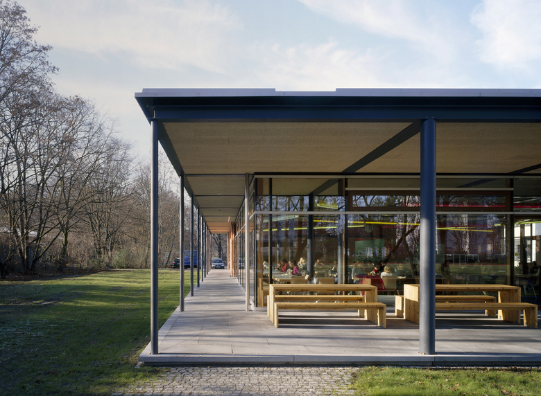 Der eingeschossige, rechteckige Baukörper ist mit dem verglasten Speisesaal und einer massiven Kernzone, in dem der Küchenbereich und die Essensausgabe untergebracht sind, zweigeteilt. Eine umlaufende Terrasse mit Vordach bindet das Gebäude zusammen und bietet geschützte Freiflächen mit unterschiedlichen Aufenthaltsqualitäten. Die vorhandene Begrünung wurde weitestgehend belassen und der Pausenhof neu gestaltet.