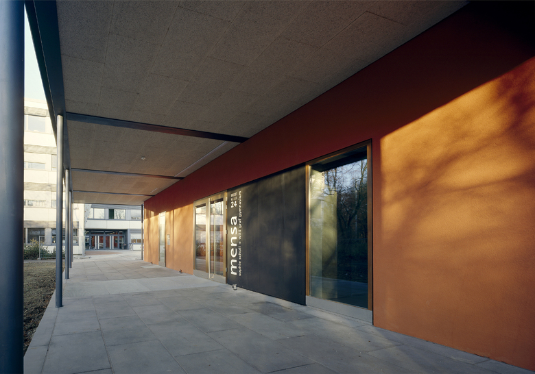 Das Gebäude wurde auf der ‚grünen Wiese’ zwischen den beiden bestehenden Schulen erstellt. Zweiseitig eingerahmt von einem alten Baumbestand schließt die Mensa im Norden an den Pausenhof des Willi-Graf-Gymnasiums an. Der Entwurf nimmt die örtlichen Besonderheiten auf und passt sich durch Transparenz in die Umgebung ein. Der Außenraum, vor allem die Bäume im Wechsel der Jahreszeiten, bilden die Kulisse für den Speisesaal.