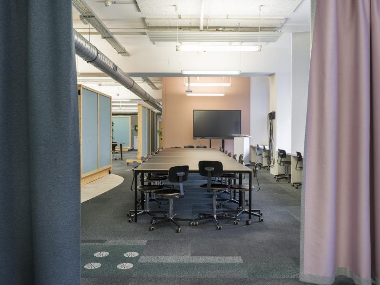 Ausgelegt für die über 100 Lernenden der BSFU wurde gemeinsam mit den Pädagog*innen in dem rund 1000 m² grossen Grundriss ein in verschiedene Zonen und Bereiche aufgeteilter, dem Unterricht angepasster, pädagogisch wertvoller Raum entwickelt – nahezu ohne feste Wände.