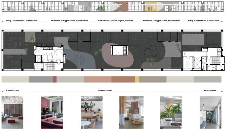 Die nachhaltige Herangehensweise bei der Umnutzung und dem Bauen im Bestand wird durch die flexible und reversible Möblierung und Materialwahl zusätzlich untermalt. Dem Leitbild der «New Rawness» folgend wurde bei der Möblierung auf nachhaltige, wiederverwendbare Lösungen wie Holzkonstruktionen oder Kartonmöbel gesetzt.