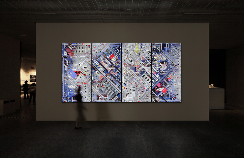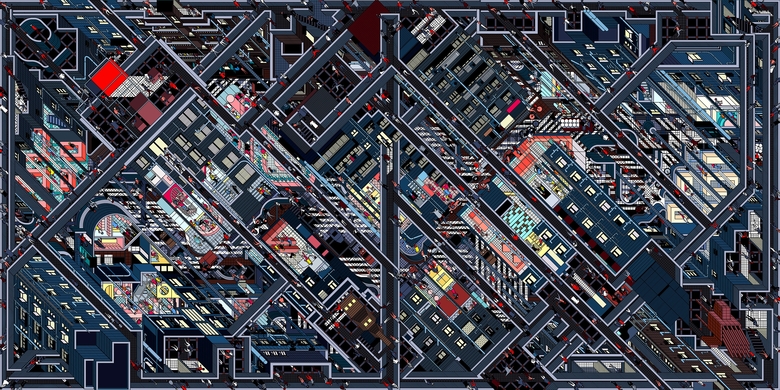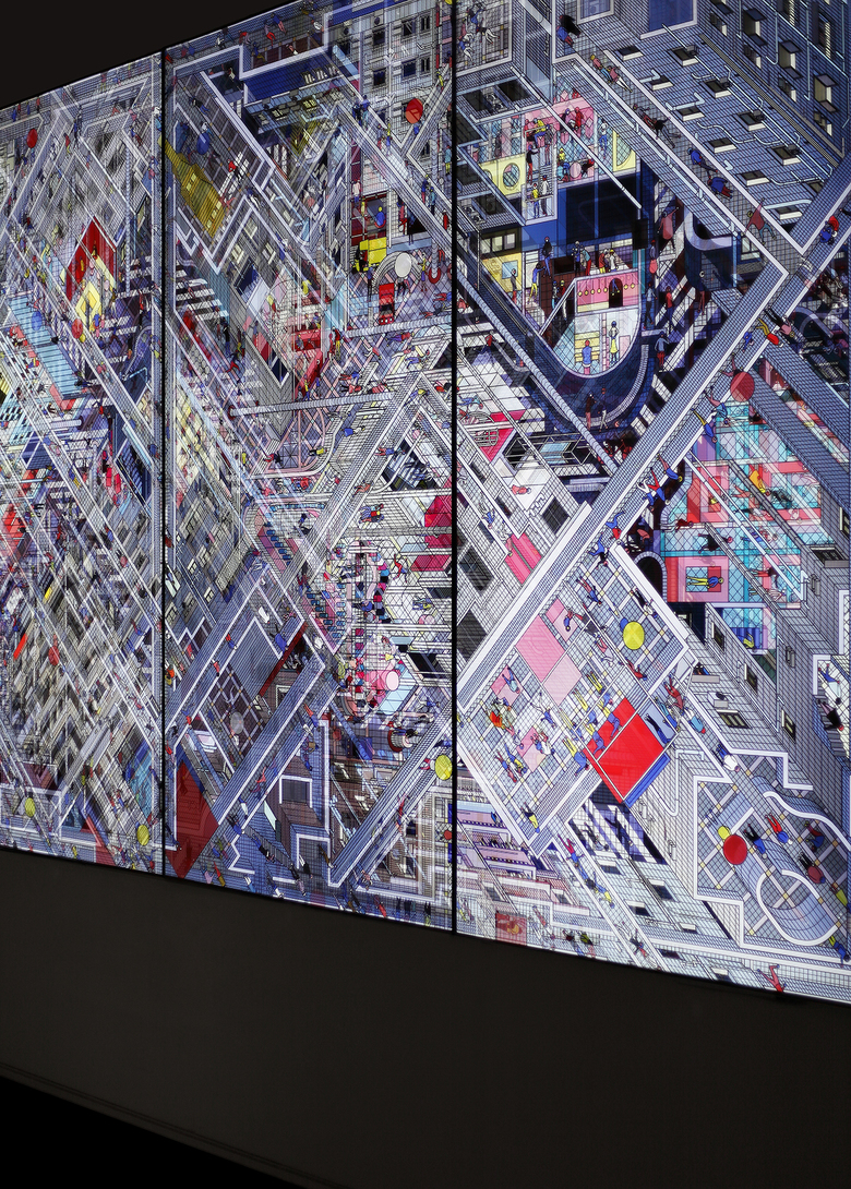 Diamond Village depicts the daily life of an urban village, Yu Tian Community, in Shenzhen. The co-existence of cross-axis and 45-degree-axis networks in Yu Tian reminds DAS of Diamond House by John Hejduk and his inspiration could be traced to De Stijl paintings by Piet Mondrian. If it is said that Hejduk developed Mondrian’s flat painting language into a spatial form, then in this piece DAS tries to transform it further into an urban settlement.Diamond Village consists of 3 architectural axonometric panoramas and presents a multi-angled visual effect in the form of lenticular print.
